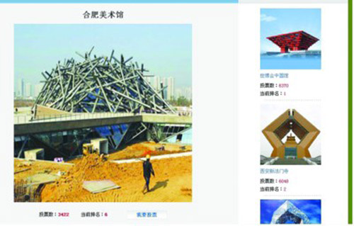 该网站称,此次网络评选历时9个月,广大网友的积极参与,最终选出的中国十大丑陋建筑是:世博会中国馆、西安新法门寺、中央电视台演播大楼新楼、华西村山寨美国国会大厦、广州新博物馆、合肥美术馆、沈阳金厦广场、上海闵行法院、中国石油大厦、南宁国际会展中心。