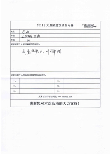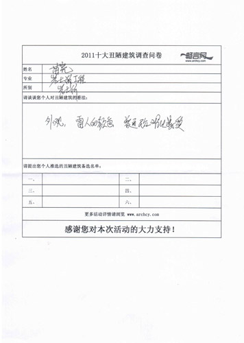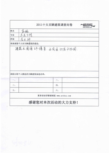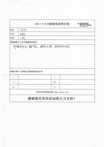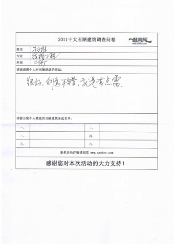 为促进建筑行业健康理性发展,畅言网在举办2010中国十大丑陋建筑评选活动后,2011中国十大丑陋建筑评选活动随即展开。为让更多建筑界人士参与到评选中来,畅言网特走进全国各大设计院,以期聆听来自一线设计师们的声音。以下是我们对湖北省建筑设计院设计师们的采访,感谢大家的关注和支持。