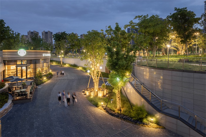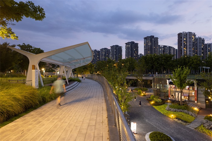 “山谷购物村庄” 定位为公园的核心社交空间,沿路设有商店、餐厅、咖啡厅、小食亭和户外聚集空间。这里的透水铺装最大程度地减少了雨水径流,而每个圆亭商店都设有绿化屋顶,不仅加强了保水效能和延伸绿地景观,亦提供了休闲游玩、野餐和欣赏景色的地方。团队也特别设计了太阳能翼屏(Solar Wings),为“山谷购物村庄”提供遮阳以外,也能发电和提供照明,更能引风吹进下沉式空间,营造舒适的微气候。