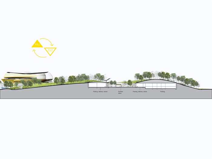 设计团队透过开掘湿地并以“山谷购物村庄”连接公园两边,在无需额外土壤的前提下,成功把原本宽广平坦的基地改造成地势连绵起伏的一片绿地,其中有些山丘更离地面20多米。这个设计忠于团队的“零土”策略,旨在尽可能减少土壤开挖对环境的影响。部分新建山丘充当自然?;で?促进生物多样性和生态保护。绿地之下是一个贯通整个公园的地下网络,面积达68,000平方米的停车位及人行通道接通所有建筑和体育场馆,在不破坏上方绿地景观的前提下为公园全区提供效率极高的后勤运作、货运路线和人行通道。地下还设有电影院,为市民提供了又一娱乐场所。