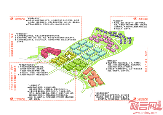 生物医药产业园核心区定位以单抗、疫苗类医药研发生产为主的高端生物制药平台,共分为七大功能区块,以利于分期建设。
