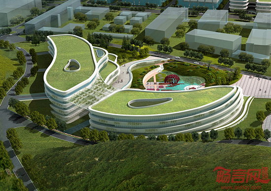 公共检测服务中心依山就势,合理顺应等高线,将建筑各功能空间、屋顶绿化与周围景观、道路、广场有机结合成一体,形成与山体形态相协调的曲线形建筑风格,达到“山屋共融”。