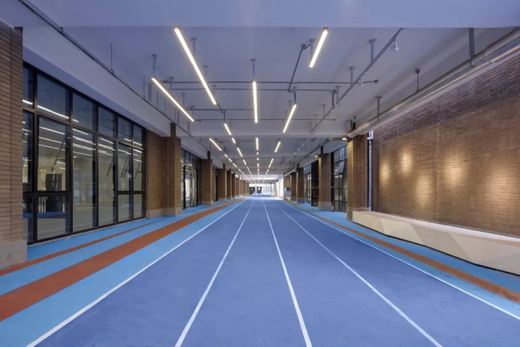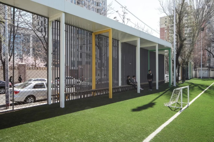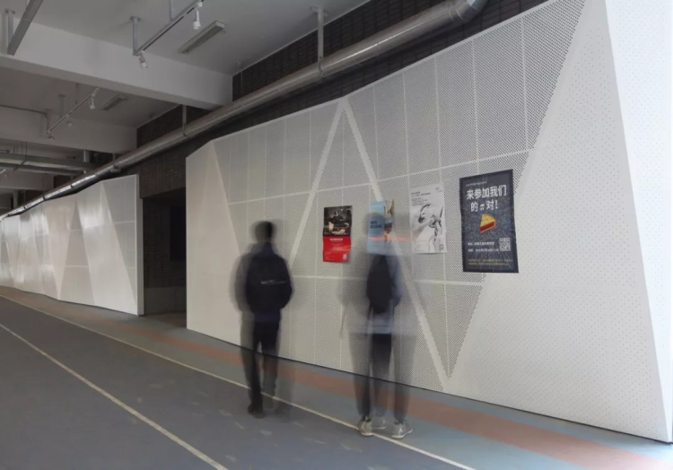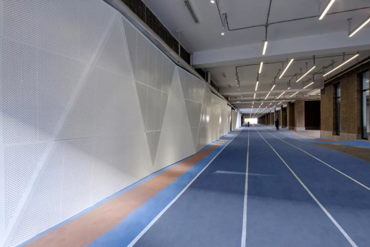 我们还在一条原先光线昏暗、功能模糊、利用低效的楼间消防通道,地面铺设了跑道,墙体间嵌入功能件,升级为一处集跑道、休息区、宣传栏于一体的复合功能空间。其中的百米跑道成为学校利用率最高的体育训练场地之一。