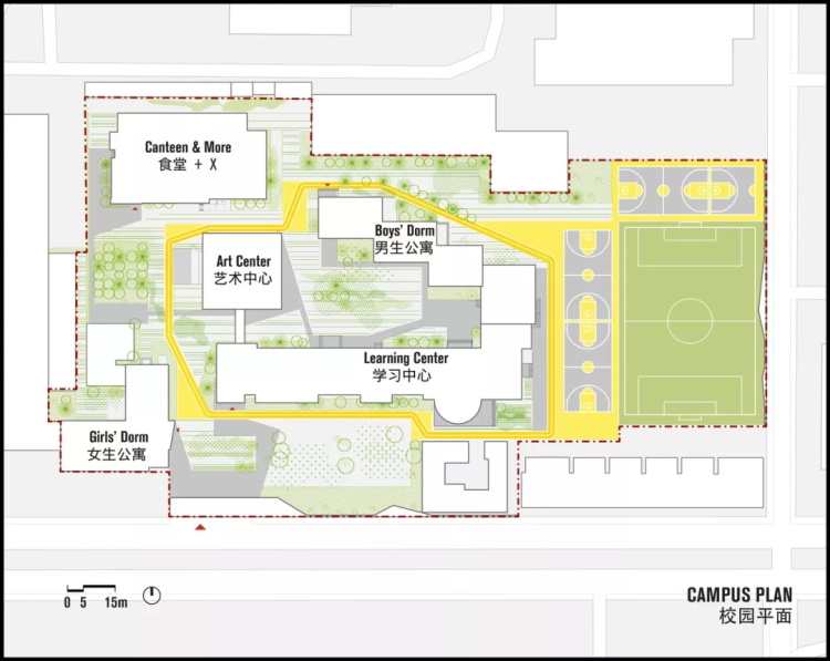我们发现,传统校园里的交通动线基本是以车行干道为主导、人行动线依附于两侧的。这样,虽然人员在校园内通行与活动的频率与范围都远大于车辆,其优先级却被排在了车之后。
