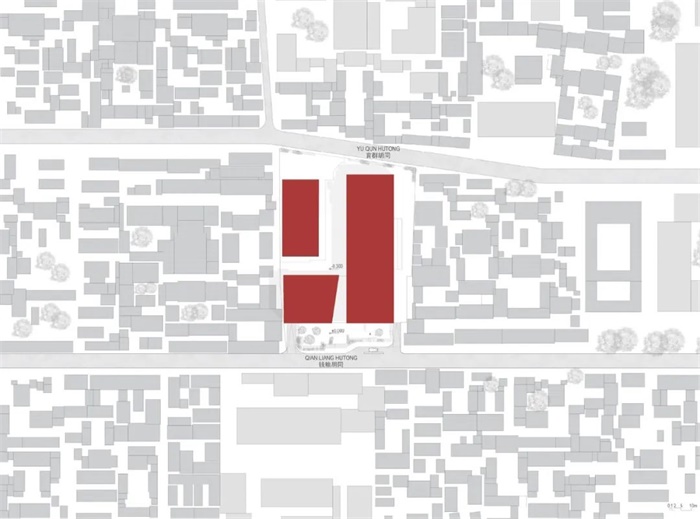 项目跨越街区两边,南北两侧均有入口。周边区域狭窄,空间常常起到连接传统胡同的功能。这座建筑占地面积庞大,打破了传统胡同的既定肌理,让我们有机会为该区域创造新的空间类型。服务式公寓与临近的商业空间构成更大街区,为公共空间创造活跃的氛围。