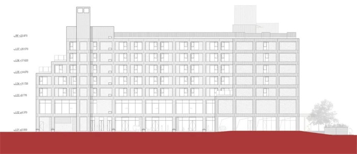 人对建筑的体验不仅限于地面层的人体尺度。这栋建筑从远处即可望见,因而还需要具有可识别性。我们用框架将建筑包裹起来,将其容纳的不同功能进行整合,创造一个简洁而强有力的形象,使其从周边环绕的杂乱混沌中脱颖而出,并唤起一种秩序感。