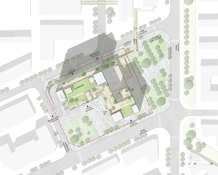 本项目位于深圳市梅林-彩田片区,凯丰路与梅华路交叉口西北侧,北接城市主干道梅林路,东接城市次干道凯丰路,南侧临近城市快速路北环大道。场地方正,东侧与社区公园及相邻,南侧远眺莲花山公园。但地铁的斜穿给建筑布局带来的很大的困难,若沿斜切线控制轮廓,将产生不好用的斜向建筑平面,而且地面以上的建筑布局并不因地铁的斜穿带来更好的机会,我们希望通过设计解决这个不必要的缺陷。