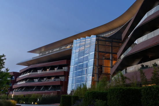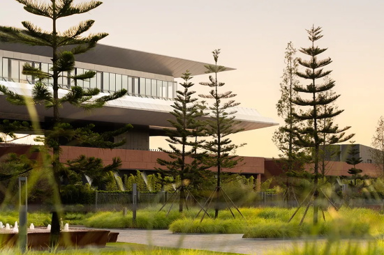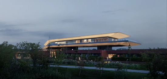 客房逐级跌落融入环境,公区架空在其之上,酒店在入口侧仅有2层体量,掩映在环境之中,与周边展园等建筑协调呼应。同时,逐级跌落的形态也将酒店功能自然延伸到了河岸,给酒店扩充了更加多样的室外活动和亲水空间,丰富酒店的入住体验。