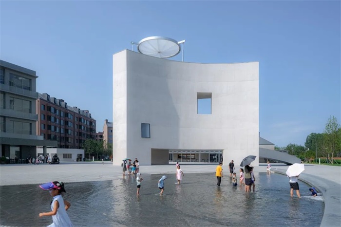 礼堂位于社区中心,建筑平面轮廓的三个端面分别回应人流进入广场和大海的方向,而三段内凹曲线则对广场上的三组相邻建筑进行适度退让,共同围合出不同氛围、尺度的公共空间。