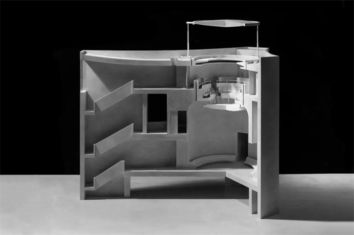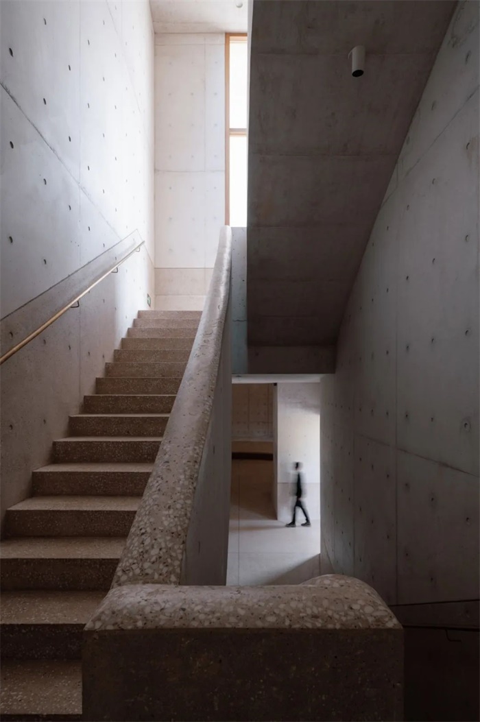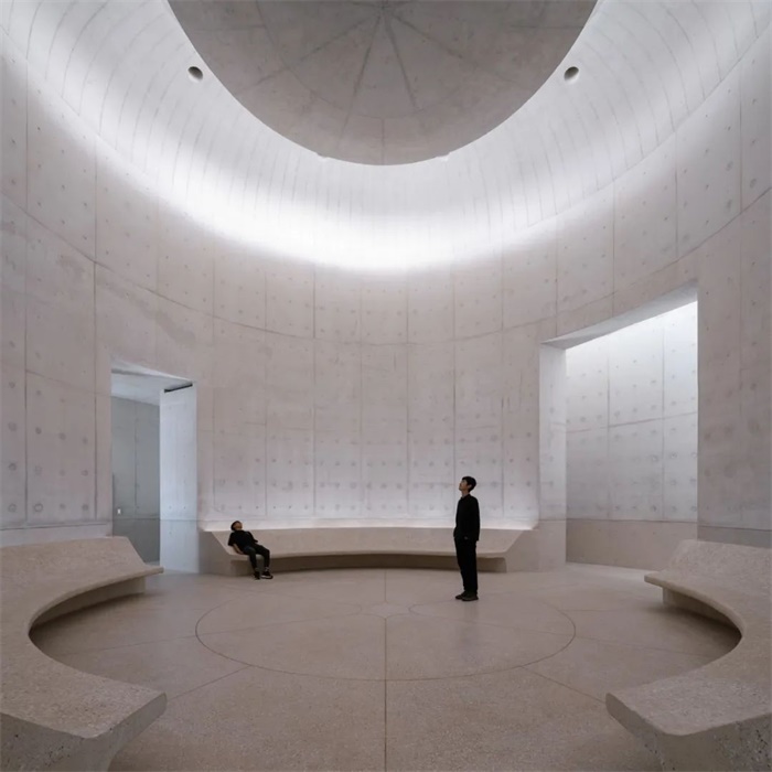 位于首层的冥想圆厅高9米,弧墙与地面在墙角处留有一圈50厘米宽的开启扇,空气可上下流通,漫射的自然光同时从墙角和悬浮圆盘四周的缝隙渗入。由混凝土浇筑而成的座位环绕圆厅布置,形如躺椅,人们可自然后仰,感受音乐、自然光和风在空间穿透和弥漫。