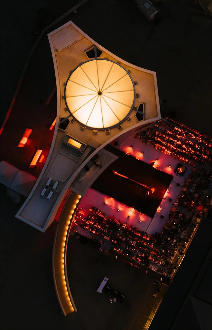 音乐厅顶部设有一个可升降的圆形气枕屋盖,当天气适宜,屋盖升起,音乐厅将成为一个户外剧场。