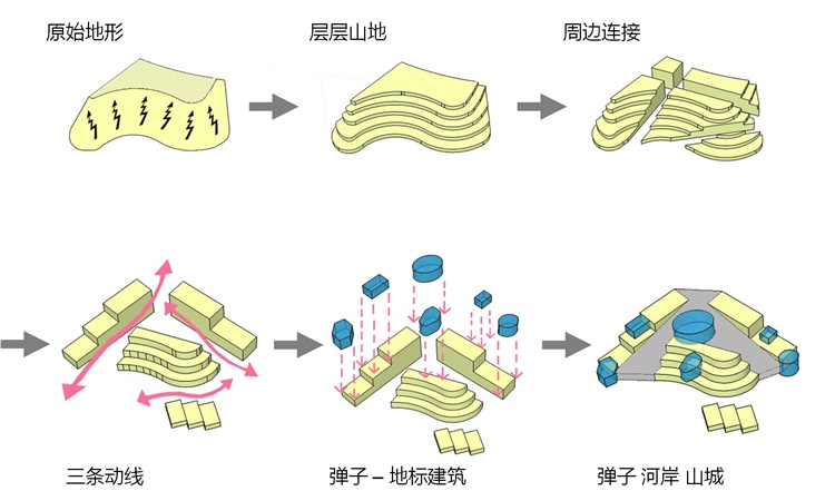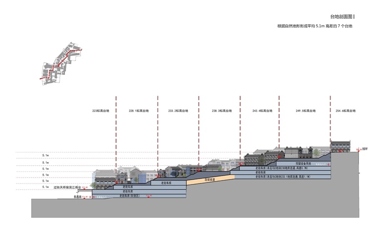 地块最高和最低点之间相差 80 米,其独特地貌为开拓过程带来了额外的挑战。就此,设计规划并未选择将其铲平方便发展,反而选择达成多平台布局的构思,顺应天然地势,将影响减至最低。此等平台均以楼梯、电梯或其他垂直移动方式连接起来,令人流通行无阻。多平台的设计同时也能全面发挥地块临江的优势,让游客可以从多角度欣赏江畔景色;项目内的建筑多为平房或矮楼,令空气更流通,炎炎夏日亦能享受沿岸微风的舒爽。
