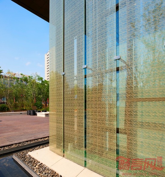 立面采用局部双层立面,内层为Low-e镀膜玻璃幕墙,在朝向北侧、西侧的两个主要展示立面增加外层彩釉玻璃幕墙,以一层一跨为单位间隔布置,上下错层,既不影响空间通透又能增加立面的变化与厚度感,丰富立面表情。