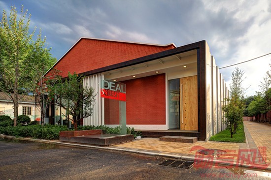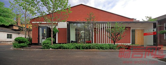 建筑东侧为办公区主入口,正面利用原有库房的主门洞,将其扩建为落地凸窗,内设特色造型接待椅,这里对外部来说具有展示橱窗的作用。在此凸窗侧面加建了一条外廊,使其与旁边的门斗共同组成一个体型巨大的框体,框体外围使用了锈铁板,侧面选用了日本Asloc-ecp板和硅酸钙板的韵律组合,强化了框体的感觉,与原有人字屋面形成鲜明对比,从而突出强化了主入口。我们在西侧加建了一组由竖向条形窗组成的与门洞等高的框体建筑,此部分外墙为局部带挑砖的清水砖墙,条形窗洞上口由层层挑砖砌筑至顶端形成深远的屋檐,高墙与砖砌框体之间自然形成了西侧入口。而入口处的水池及栈道更衬托着砖砌框体的浮游感,水面倒影强化了竖窗的纵向韵律。水池边增设一道矮墙,虚隔开入口栈道。