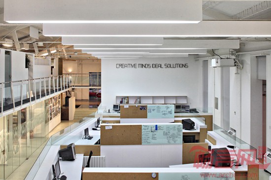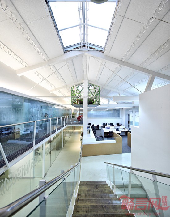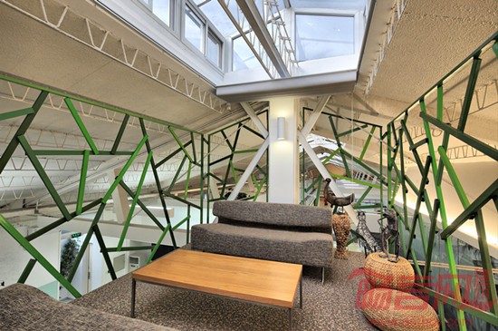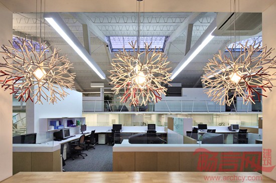 办公室整体被挑廊连接在一起,挑廊栏杆竖杆形成各种自由倾角的韵律变化,构成整体空间节奏的纽带,加之办公组团的部门半高隔断错位拼接、条形灯盒的长短组合、办公单元外围柜体墙面的曲折变化,制高点“树屋空间”的眺望凌高悬置,共同构成了室内趣味多变而又统一舒展的环境氛围。