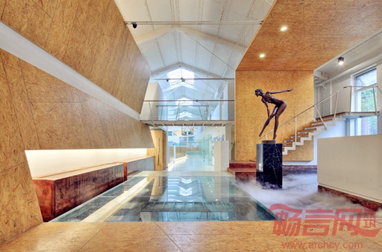 我们根据原有建筑的空间特点和结构形式,在保证建筑保温条件得到满足的基础上,尽量考虑全方位引入自然光。除了常规设置侧向落地窗外,还在加建的部分上面增设了高侧窗以及大面顶窗的光廊。屋脊中央的五个采光造井极大地增加了室内的光照效果。光从建筑最高点射入,打在金属绗架上,落在悬挑廊架上,泻在清泉水池里,将光影不经意地投在建筑的白墙上和角落里。