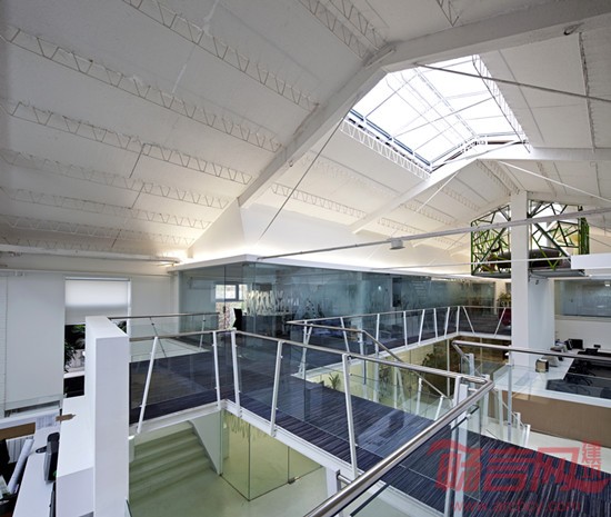 首先在节水节能方面,我们将建筑做了全面系统的内保温,在原有砖墙内又加建了一层空心石膏板隔墙,内填玻璃棉保温层;外窗均作了中空镀膜处理,顶面在原有的屋面下层设置了50mm厚石墨聚苯水泥砂浆复合隔热板,再加上地面下沉后建筑底层本身就具有良好的保温隔热性能,冬暖夏凉,大大降低了能耗。顶部的天窗有极好的采光效果,显著减少了照明的用电量。办公区人工照明全部采用高效节能日光灯管及LED灯具,同时斜面屋顶白色喷漆,形成二次反射板以保证照明的均匀、柔和、高效。办公区采暖利用了园区的施政供热系统,主要采取传统暖气与局部VRV空调相结合,同时,在开放办公区采用设备新风热回收系统等诸多措施,在保证了建筑的绿色环保的同时也降低了建造成本。