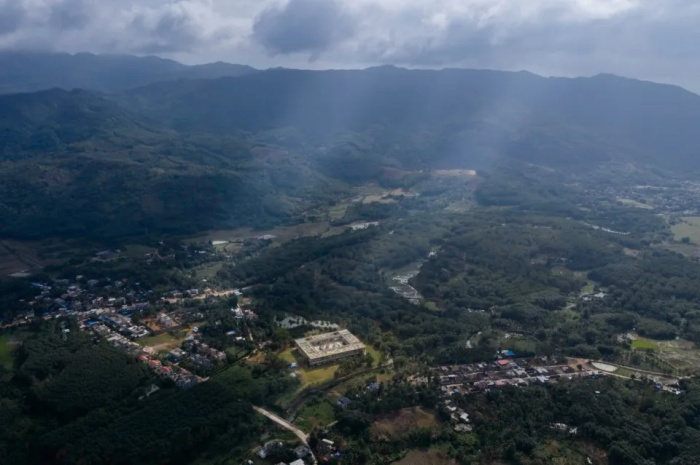 雨舍的设计始于一场雨。海南的雨季,雨总是来得毫无预兆,停得也同样仓促。那天骤雨停歇,空气中还弥漫着潮湿的凉意,我们攀上场地中央的沙土丘,脚底的沙粒沾着水汽,软绵绵地陷落,四周的林木和山谷在雨后忽然现出清晰的轮廓。雾气低垂,像一层薄薄的纱幕,远处的山峰一半隐没在云层之中。那一瞬间,整个场地的层次与边界被清晰地揭示出来:哪一段地势会被淹没,哪一处地形在雨后才会显现,哪一条路径因为雨水的冲刷而蜿蜒可见。自然在短暂的开阖之间,将一种潜藏的秩序悄然呈现。我们于是决定,把这份转瞬即逝的可见性凝固下来,把建筑整体抬升五米,以此回应那条“时节—气候—地形”的隐秘分界。这不再是简单的几何操作,而是一次与时间的契约。建筑要在这里学会顺应和等待,懂得何时退隐,何时显露,何时聚拢人群,又何时让自然独自陈述。