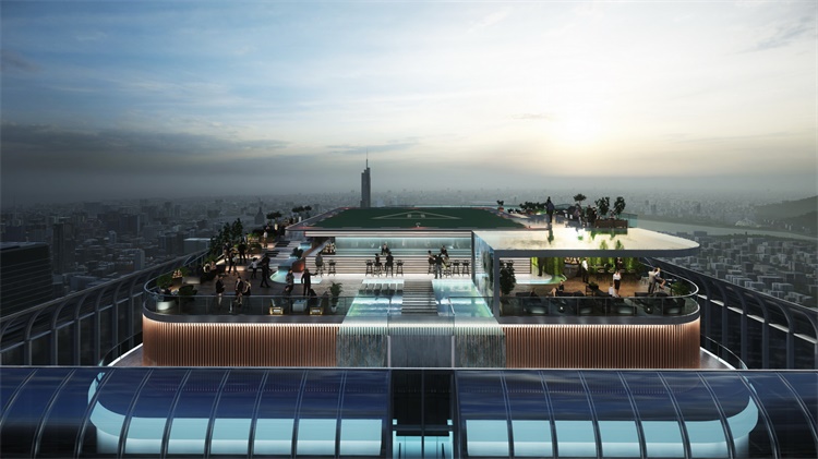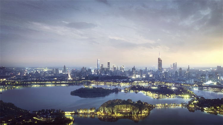 塔楼基座采用舒展的弧线,首层大堂内部沿用四瓣这一基本形,从主体到细节设计一气呵成,夕阳余晖下,佛如一枚玉石印章,端方大气。中下层的办公及酒店服务设施区域,自然光照充足通透,宽敞明亮。视野极佳的高层是酒店,可以眺望玄武湖、紫金山美景,一览城市景观。顶楼创意的水下餐厅和拾级而上的屋顶酒吧,让人们在错落有致的平台远眺城市美景,感受这座伟大城市的千年变迁。