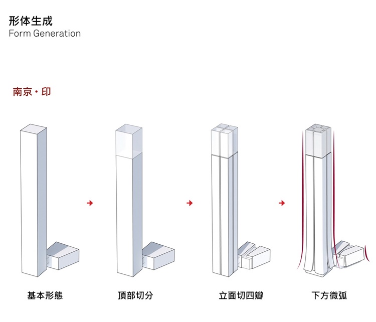 南京新街口核心商圈位于南京古城中心, 被誉为“中华第一商圈”。地块周边高楼林立,是南京重要的高层核心集群。Aedas以设计意向为突破,从中国传统艺术篆刻印章中获取灵感,“印”字左部是“爪”,右部是“节”,合起来是手持符节,执者为信,充分体现苏宁“至真至诚”的企业精神。我们尝试挖掘出蕴含在这座千年古都的内在气韵,并融入现代的表达元素。微微向上收分的线条,典雅内敛,将现代的形式美感与传统的人文内涵达到恰到好处的和谐统一,为老城区注入蓬勃的生机活力。