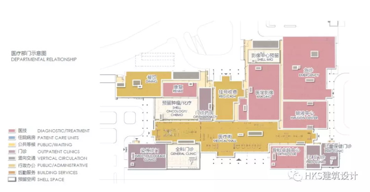 门诊楼未来将会面临整个医院最大的人流量。因此,医院主入口位于两栋门诊大楼之间,直达医院内部公共街区-医疗街。 医疗街作为分流病人、家属及医护人员的空间枢纽,引导大量人流进入门诊楼的东西翼, 连接从地下室到地面层的竖向交通, 提供医院所需的商业功能,并且连接门诊楼到医院北侧的医技楼。医院的主要功能如急诊部、放射科和手术部均位于医技楼内。住院楼位于医技楼上部以加强彼此之间的联系。