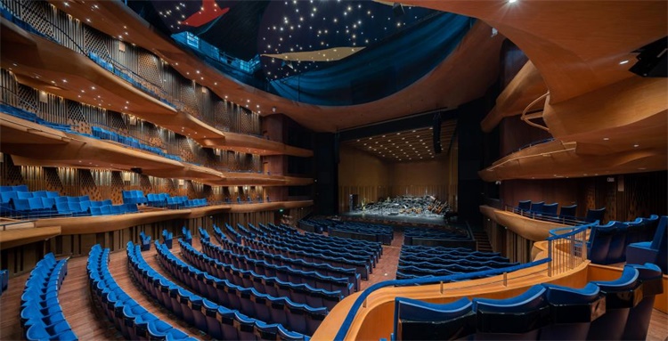 上音歌剧院地处衡山路-复兴路历史文化?;そ智?,设计充分考虑了历史街区的城市文脉。建筑立面材料采用GRC(玻璃纤维增强混凝土)板和UHPC(一种新型材料)挂板,色调和尺度与周围历史街区建筑呼应。走进歌剧厅,观众席的一片蓝色和剧场的点点星光交相辉映,目力所及之处尽是声学机关。剧场内马蹄形结构(观众席呈半包围式的环形结构)让观众更贴近舞台,即使在三层,也不会觉得离舞台太远;独特的可升降反声板和有开合功能的乐池设计能为各类声乐、器乐演出提供一流的声场效果;座椅后方的字幕显示屏可提供8种不同语言的字幕切换,当今世界只有维也纳国家歌剧院等国际级的歌剧院使用了这一技术。业内专家表示,这座歌剧院是一座世界一流表演天堂,是集文艺演出、艺术普及、原创基地、国际交流为一体的现代化智慧歌剧院。