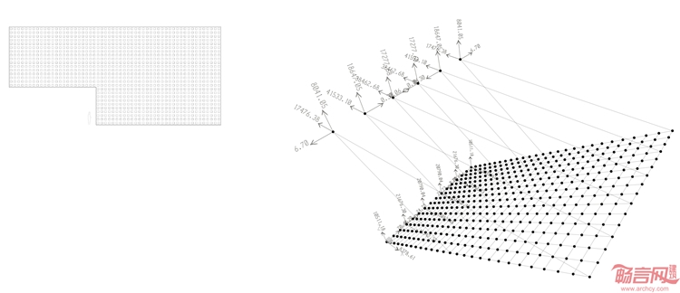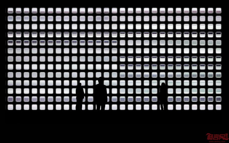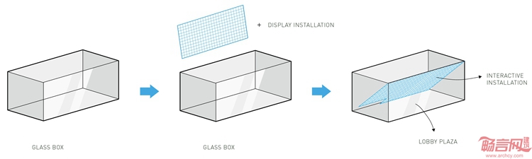 走进大堂,在一个全透明的空间之中,一面由1400块250*250mm的定制LED屏组成的交互装置倾斜安置在视线上方,屏幕由铝合金框架支撑。