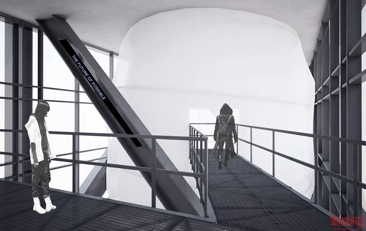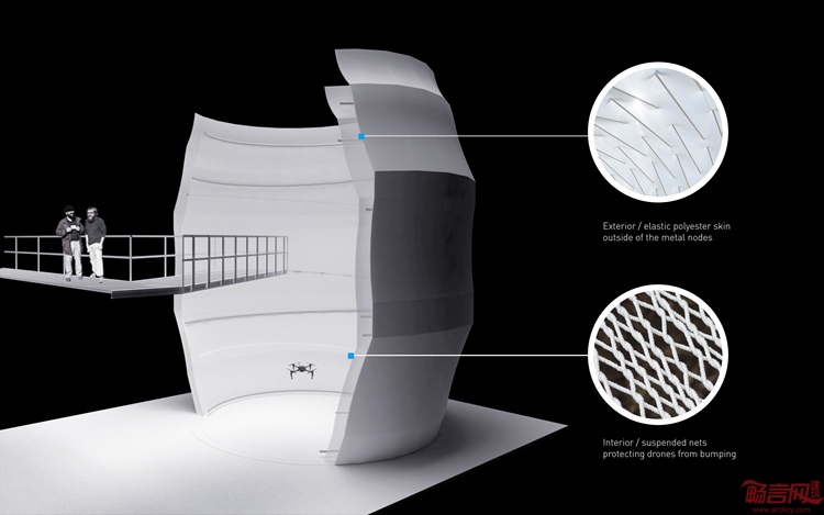 汉诺森的灵感来源于一个软质“胶囊”。 “胶囊”隔离了原有的壁垒??萍纪黄坪纬⒉皇峭恚空庖桓鏊愕目占?,内部为防止无人机试飞产生撞击设计成悬置的网结构,外层由弹性聚酯纤维表面包裹。