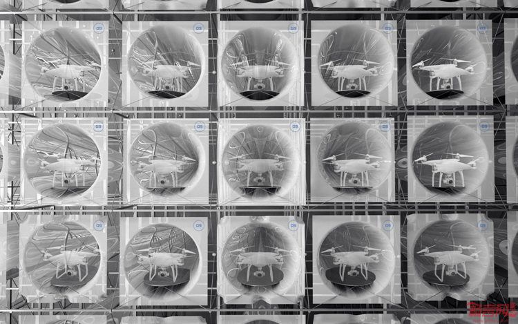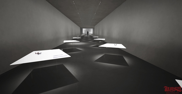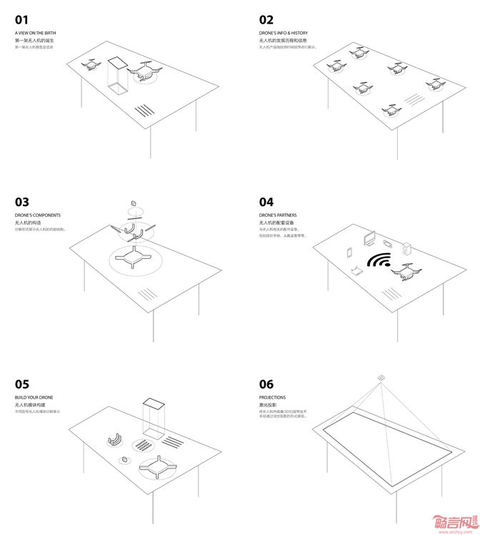 陈列展示窗以细胞结构为灵感,多个锤形的盒子镶嵌在铝合金支架的空隙中,形成排列整齐的圆形展示窗口,用于放置不同的无人机模型。这一仿生理念也流露出一种人文性的温暖。
