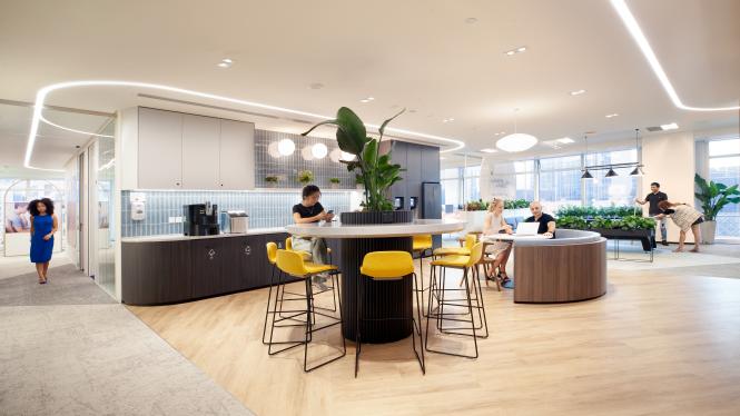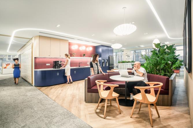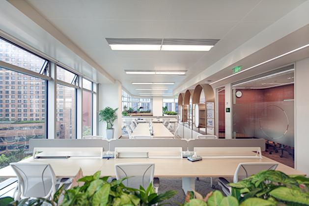 跳色调色板则适用于楼内的共享空间,如每个楼层的工作咖啡馆、会议室和协作区域等。当然,我们的所有设计均符合可持续发展标准,并已获得了LEED金级认证。