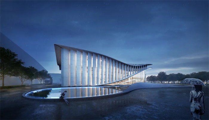 白色弧面上分割精细标志的格栅设计,巧妙的将门片隐藏,增加了更为细腻层次,保留完整的弧面构成了白天绝对明快的流畅,而直线条格栅则形成夜间不同的光影变化。