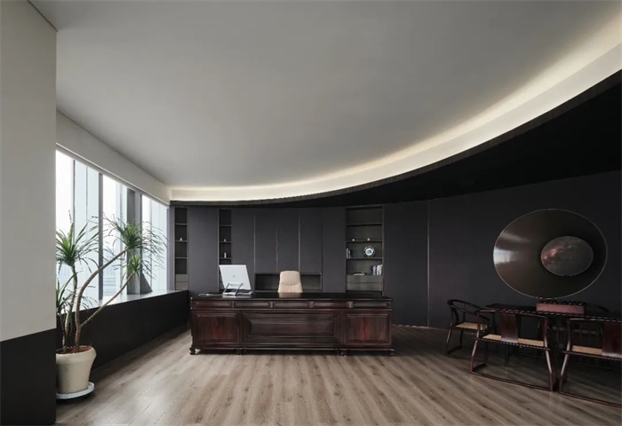 设计初始考虑两种不同使用的方法, 首先以功能划分出动静两种不同的视觉属性,顶层面向黄浦江的区域,在原始的方正塔楼格局架构下,让自由的弧形进入空间,弧墙交错之间,转换了原始结构的方形局限,形成了不同的社交活动空间;另一侧主要静态办公区,维持矩形的入口,内部大小会议空间动线分明,主次办公区进退有序。