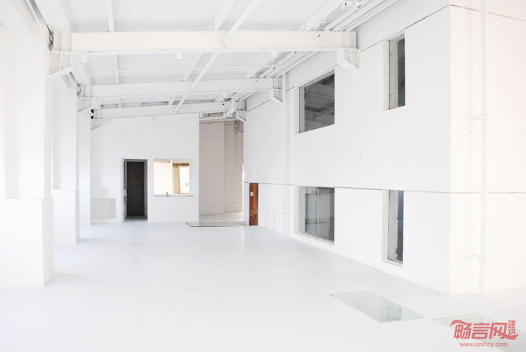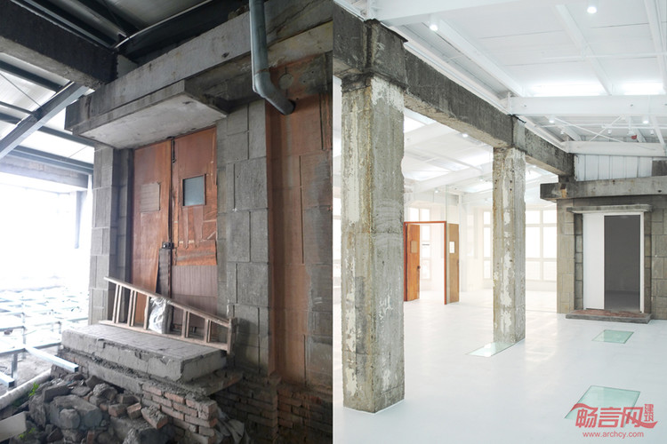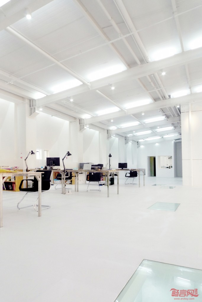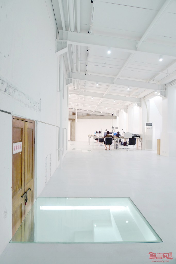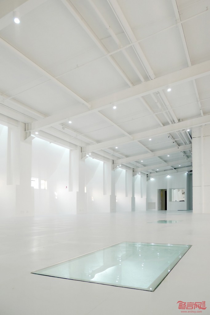 为了彰显正统建筑语言与建筑“方言”之间互动并行与辩证关系,设计保留、改造了一系列能够揭示其原有搭建的“非职业”的设计元素:钢构架屋顶通过白色喷漆处理,使原有锈蚀的混凝土梁柱依然作为结构核心被完全保留;房间采用架空的白色地胶板,五个镂空设计的地下橱窗玻璃镶嵌其中,展现了原有粗糙倾斜的排水屋面;从屋顶到仓库,从废弃到重新利用,疏散门的雨棚和粗糙的马赛克墙暗示着这片空间定义的变迁。