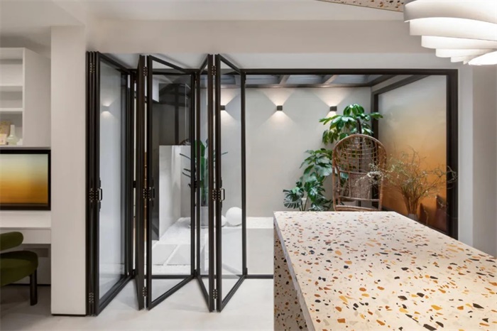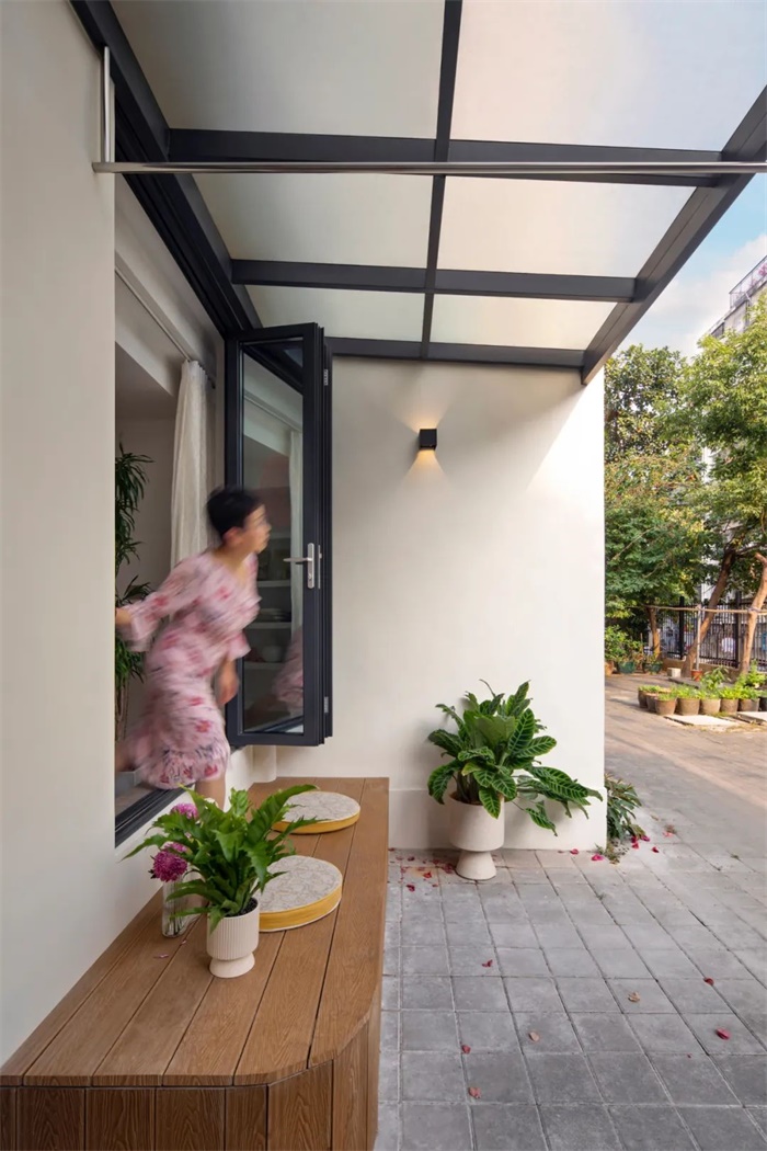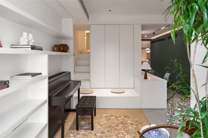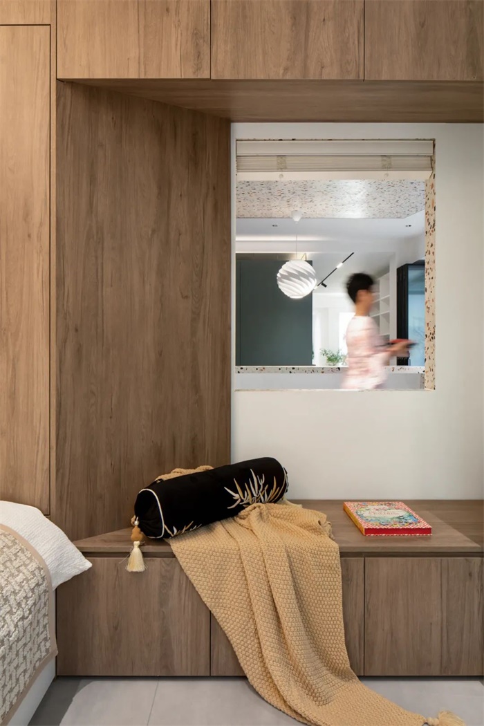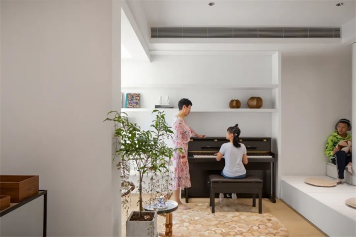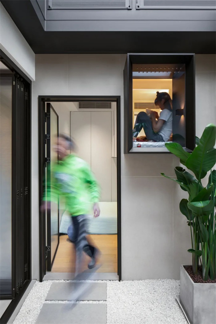 所以我们的策略是把家居空间当成了传统的街巷空间来设计,南方民居里特有的用于通风的“冷巷”被移植进来,贯穿空间南北。家庭成员的“独立”空间分散在“街巷”的周边,如邻里般相对私密,减少因生活习惯不同而导致的相互干扰。起居室被设计成“小广场”或者叫社区小型“图书馆”是家庭成员间共同学习,讨论的空间,家人们或坐,或半躺,或席地盘腿,轻松自在;更可以打开折叠窗,和偶然路过的邻居坐下促膝而谈。