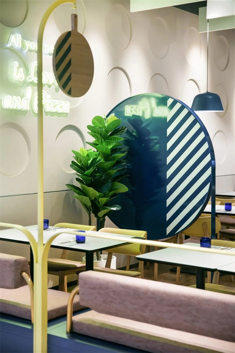 空间内的造型设计,贯之“披萨几何”的设计概念后,顿然生趣,实现了由平面几何与层次的拼接,到平面层次在立体空间中的变化,现代简约,时尚活泼。