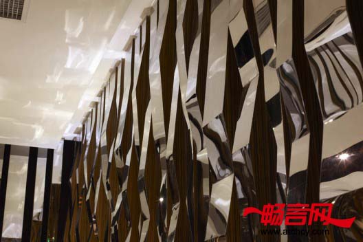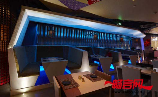 折纸式的设计自然的分出了以上几个区域。这几个区域的不但色调各异,使用的装饰材料也各不相同:有的使用打孔的铝合金板、有的使用半透明石板,也有的使用亚麻织物进行装饰。在不同灯光效果的照耀下,每个区域都显得十分宽敞。悬挂的折纸式天花板将从入口处到餐馆尽头的VIP客房之间的各个区域连在了一起,从而,整个餐馆就形成了一个整体,而各个区域之间也有了一个自然的过渡。