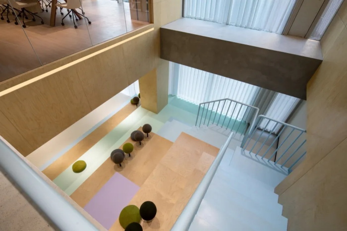 进入办公楼最先引人瞩目的是五楼和六楼连接的开放(会议室)大阶梯,大阶梯每个体块各异,我们设计之初就将他们分为abc三种类型的体块安插在大阶梯群中,目的是为了其承载更多功能,不仅可以容纳30-40人开会,也可以成为员工们临时讨论工作亦或是休闲,看书,聚会的场所