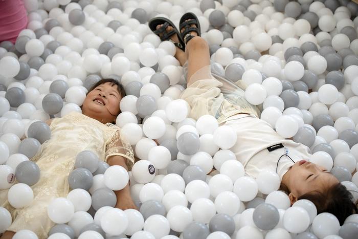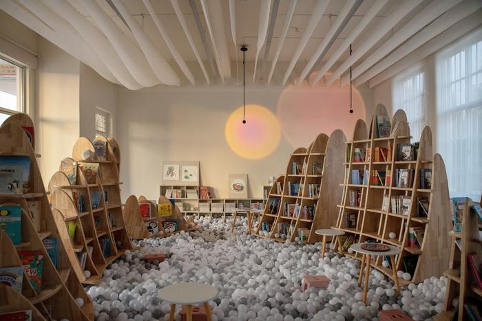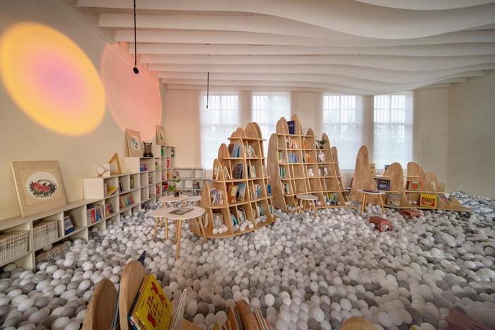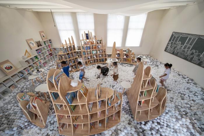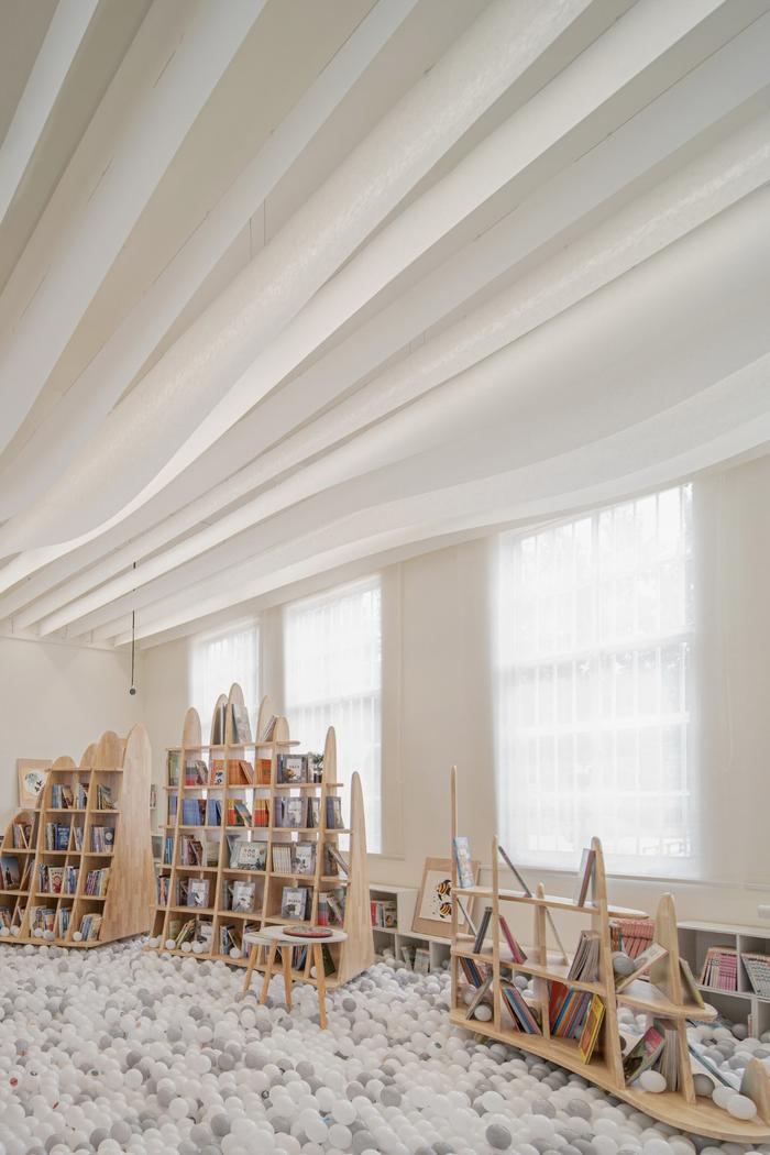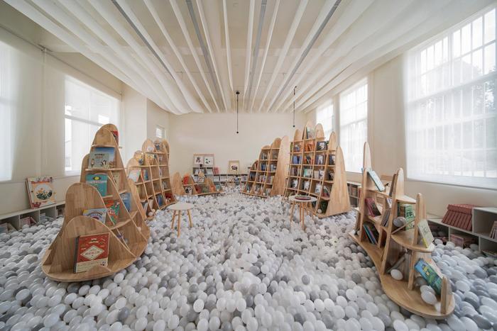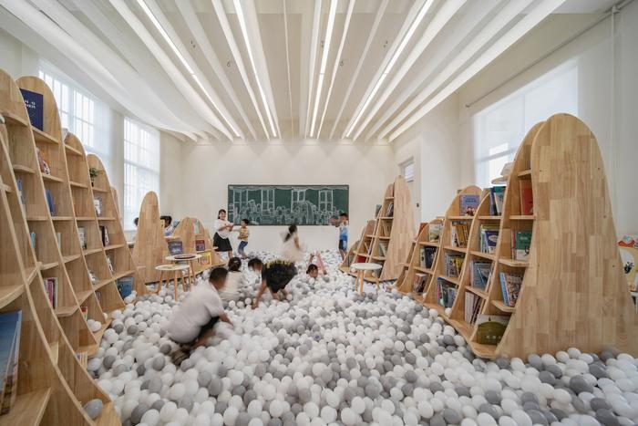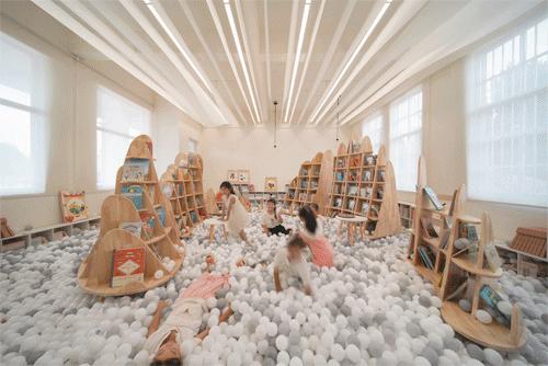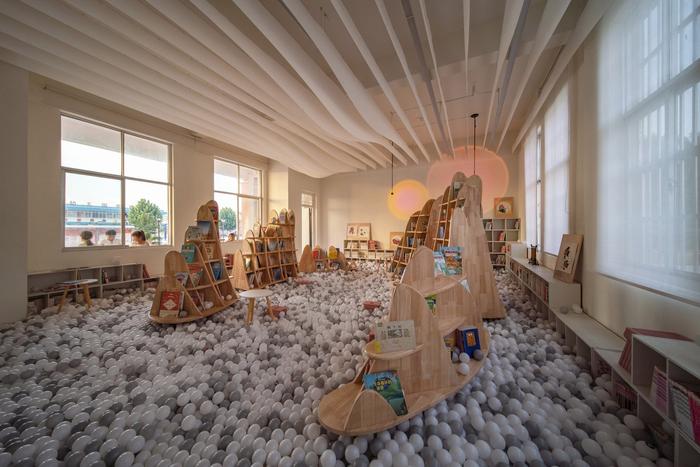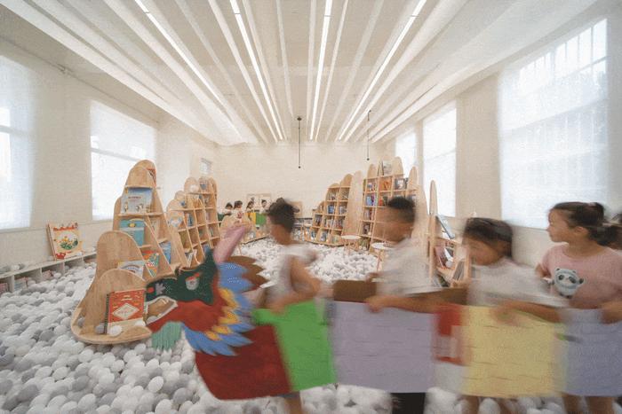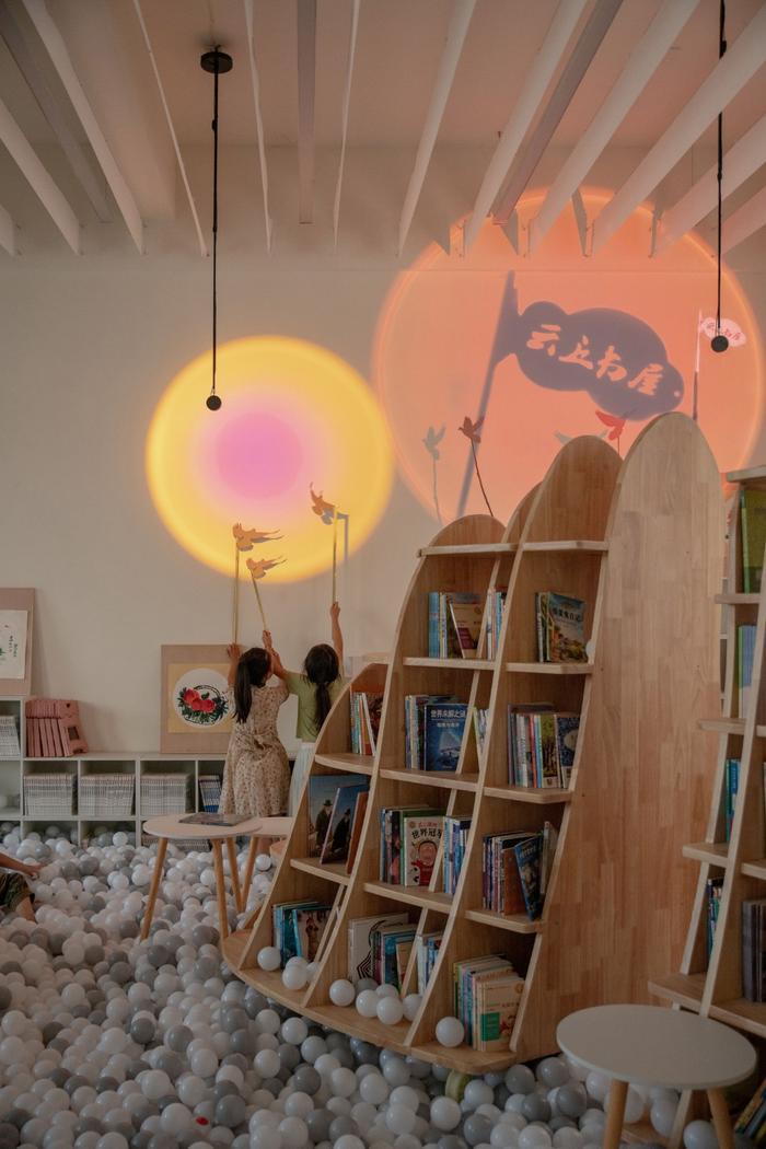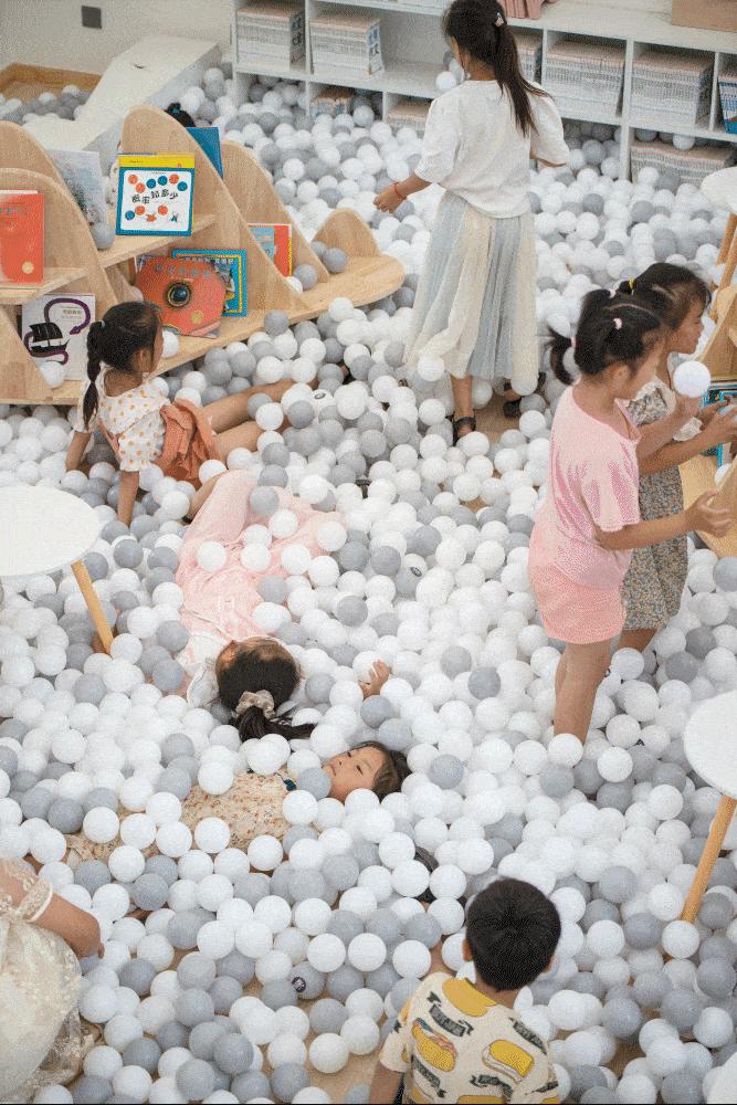 我们将云海搬到了小小的图书室中,用以映射一种身处于山岭之巅的“登高望远天地阔,纵横捭阖自从容”之感。通过使用海洋球,更具象的赋予这个空间独属于童年的乐趣,打破空间及功能的限定,为其带来开放和活泼的氛围。孩子们在这里“游龙、戏珠”,寻觅藏在云海间的诗句奥秘,享受着成长的快乐。