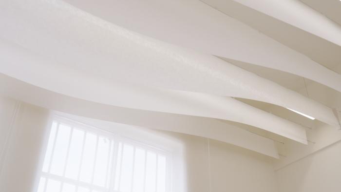「云」的设计效仿壮美的云海,将空间顶部饰以轻盈的纹理纸云栅,搭配柔和的人工照明,为空间带来温和的气质。吊顶云幕消解了原本空间高大空旷的场景氛围,以更亲人的姿态营造置身于云端的体验,对话自然、消隐边界,开启想象与未来。