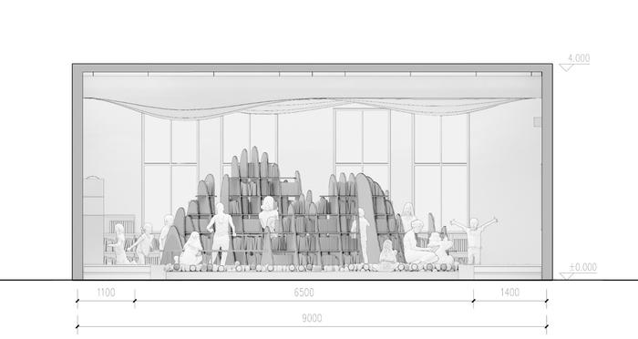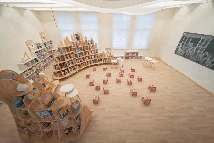 另外,这种设计还能够营造出层次感和视觉上的趣味性。连绵起伏的造型和可移动的书架体块为空间带来了变化和动态感,使整个图书室更具吸引力和活力。它不仅提供了阅读和学习的场所,还为孩子们带来了更多互动、创造和娱乐的机会。