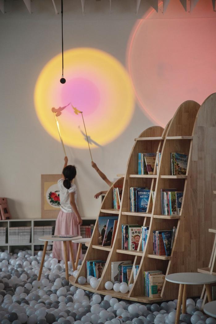 我们通过声音和灯光效果来增强空间的趣味性,用两盏吊灯为墙面增添一抹晚霞的色彩,也为孩子的创意光影游戏搭建舞台。我们还在空间中设置一些互动设施,如益智游戏区、拼图墙或故事角落。这些设施可以帮助孩子们在阅读之外获得更多的娱乐和学习体验,让他们在玩乐中不知不觉地提升阅读能力。