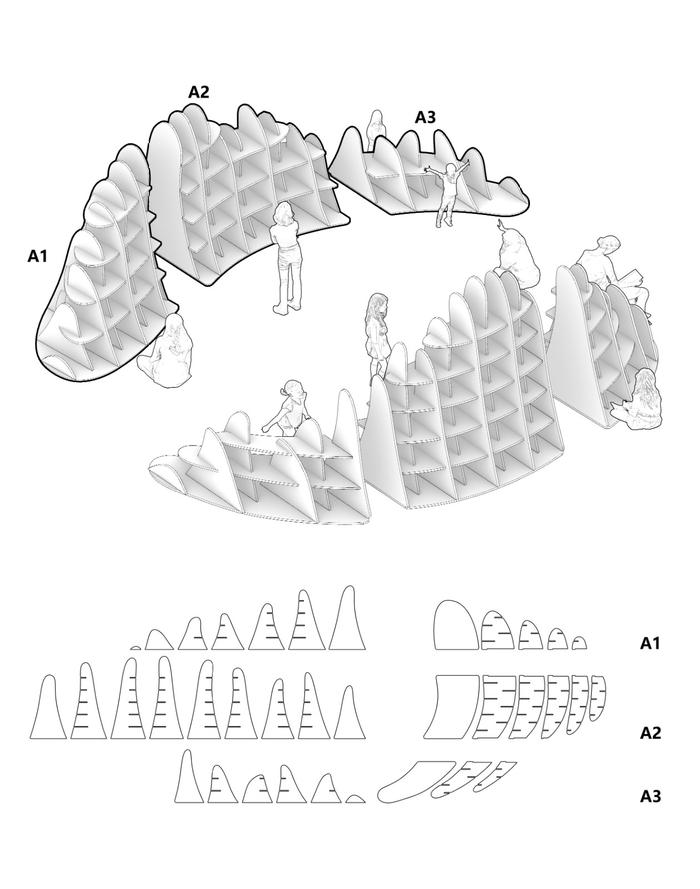 「丘」的设计源于层峦叠嶂的山丘,通过垂直和水平方向上的线条提取,将两个相互围绕的山的原型,划分为六个可自由移动的书架体块。“互动”是它们的关键词,六个可移动的书架体块在小空间进行灵活的组合和移动,与人发生最多的活动关联。这样的设计可以满足不同的需求和场景,除了作为日常的阅读空间,还可以通过移动与组合、围合与开放,为特色课程、家长会、话剧表演等提供一个轻松愉悦的场所。