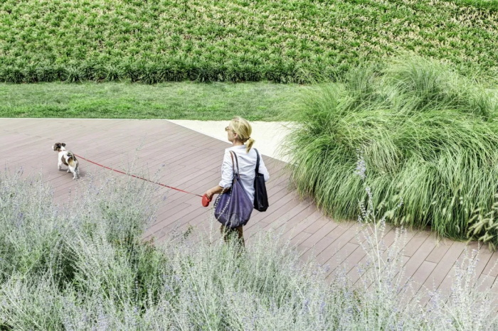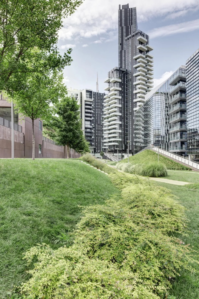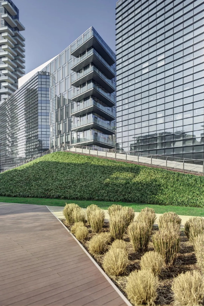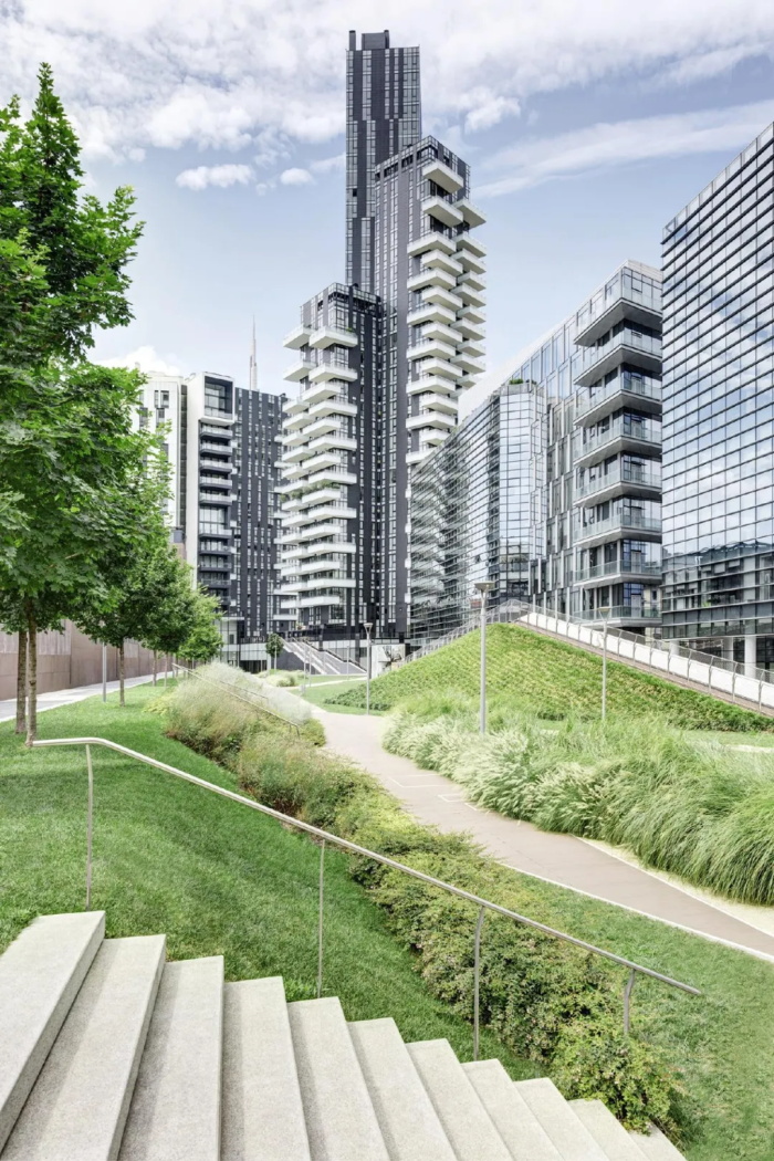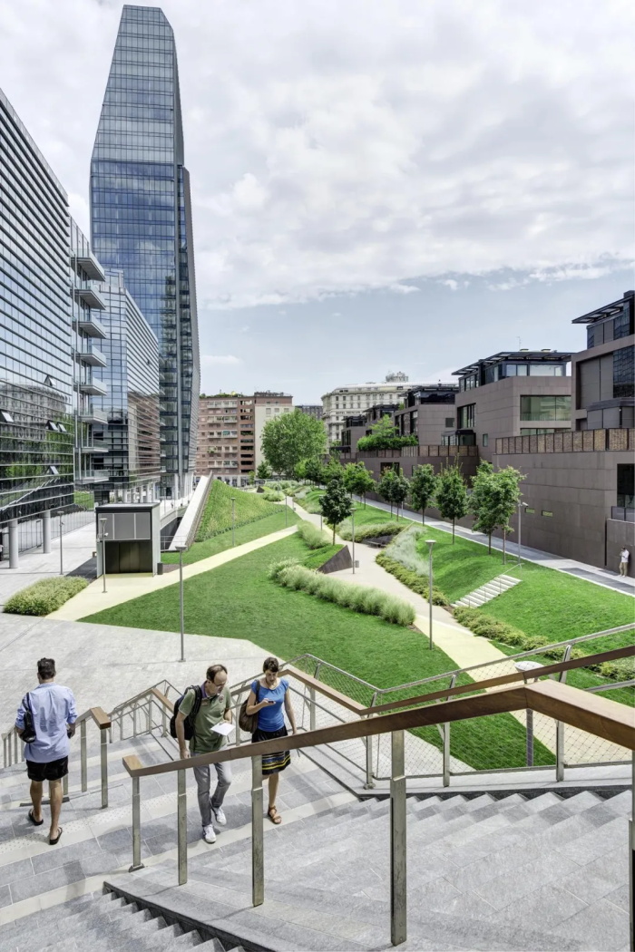 景观设计的重点在于以一座广阔的公园重新构想了这片区域的景观,打造一个开放的,兼具人性化的,充满活力的新绿地。项目在其内部庭院和主要步道中精心融合了硬质景观和软质景观元素,打造高品质的公共空间,包括广场、人行道和公共花园。将该区域从一个单纯的区域连接点转变为米兰居民充满活力的社区生活和互动中心。