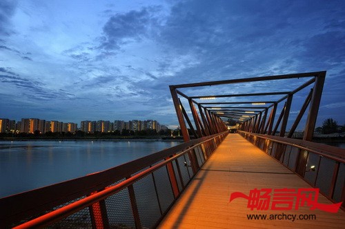 罗弄哈鲁士桥由Thryc建筑事务所设计,位于榜鹅新城的东部,它架起了河流两端的河畔休闲区和新罗弄哈鲁士湿地之间的联系。罗弄哈鲁士桥远离新加坡市中心,它由波浪似的钢结构漂亮外形吸引着城里人来此,在美丽的自然风景中休假。因为这里的特色就是自然和野外生活,所以建筑师将桥梁外形设计的优雅而又宁静。带有乡土气息的红色外观与周围绿色的自热环境相得益彰。