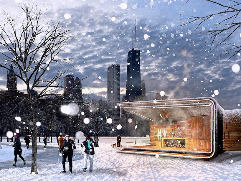 在芝加哥短暂、宜人的夏季中,每天有6万到7万人参观湖滨。冬季来临时,游人一去无踪,使这一区域成为荒凉的冰原。Klye Bigart设计的Urban Therme项目,采用古罗马水疗建筑类型,凉亭结构让游人和市民尽情享受湖畔美丽的风光。曲面和缓的建筑外形提供冷热水浴、干式桑拿等体验,无需设施的更新。