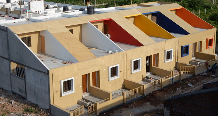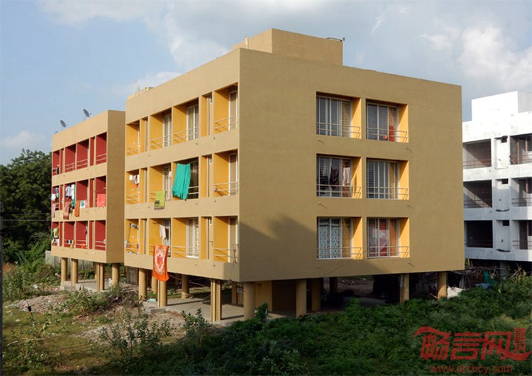 SPACE事务所设计了印度Gujarat保障性住宅。项目利用色彩明亮的建筑体,从周边环境中脱颖而出。开发项目包含一座倾斜的公寓楼以及一排两室独立屋,不同的颜色将相邻建筑区分开。这个项目面向中等收入的家庭,与周边装饰华丽的传统建筑形成对照。项目名为Stanwood住宅,设计师希望超越传统装饰,寻求纯粹的建筑形式。