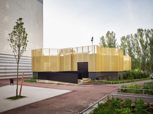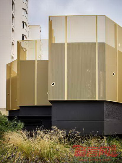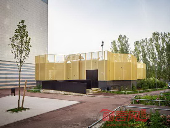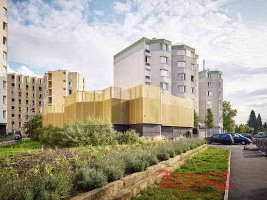 CUT建筑事务所完成了位于法国蒙特勒伊的社区中心的翻新改造。项目面积230平米,于2014年完工,项目预算47万欧元。社区中心坐落于一个社会住宅项目内部,初建于1960年代。尽管建筑年久失修,依然被当地民众认为是一座标志性建筑。翻新工程对其块面状黄色外观致以敬意,添加了金色镀锌穿孔铝板,作为一层全新的表皮。