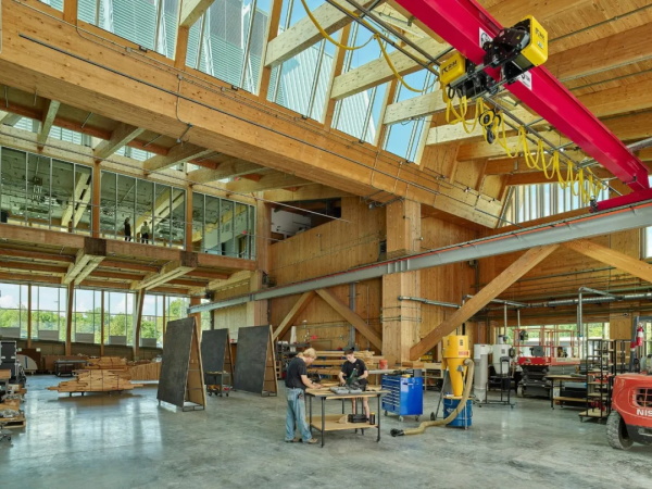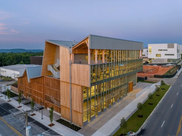 安东尼·廷伯兰设计与材料创新中心(Anthony Timberlands Center)在阿肯色大学费耶特维尔分校正式落成,这是 Grafton Architects 在美国首个竣工的项目。该建筑由 Grafton 与当地公司 Modus Studio 合作设计,占地 42000 平方英尺,采用大型木结构,是结合材料研究和地域特色,打造环保校园建筑的典范。