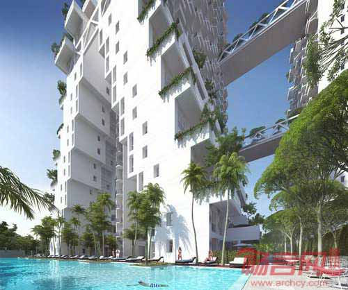 公寓结构相当合理,提供对流通风和多朝向采光。建筑适应新加坡热带气候,实现空气流动最大化。在地面平面,下沉式停车场之上的72%的场地被开发成一系列郁郁葱葱的花园、户外活动室、游泳池、步行道路,降低建筑密度感受,最大限度时住户与大自然接触,形成与村庄集群类似的住宅公寓。
