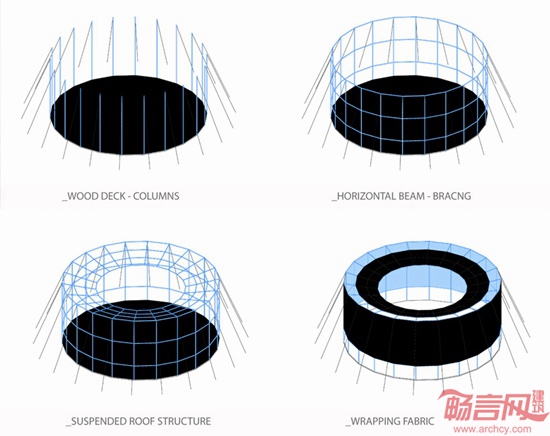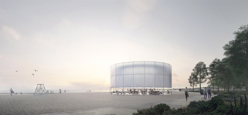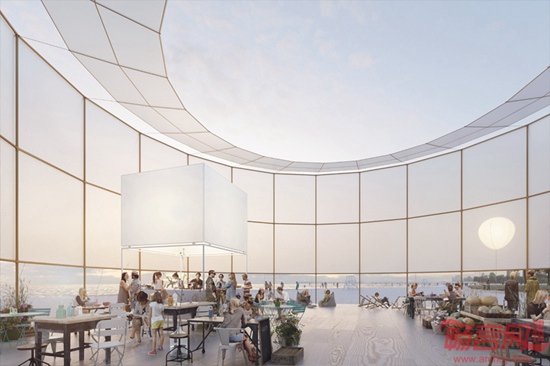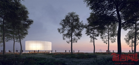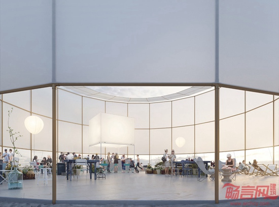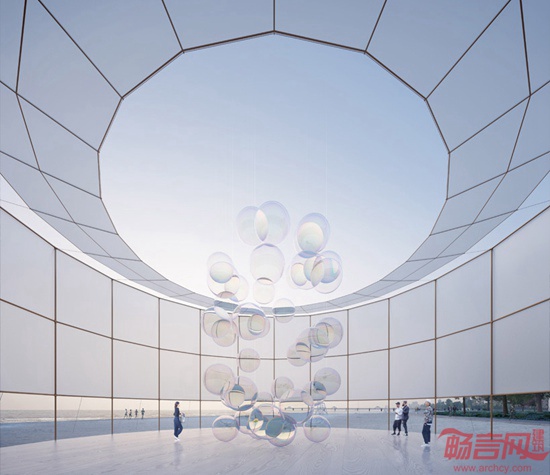 Guillaume Mazars设计了位于美国芝加哥湖畔的“环境光照”亭。项目坐落于千禧公园水岸,这里水天相接,美景天成。项目设计旨在凸显滨水区域的光照环境,注重视野营造,使游客沉浸其中。架高平台外部采用半透明织物,使光线漫射成较小的色彩光晕。